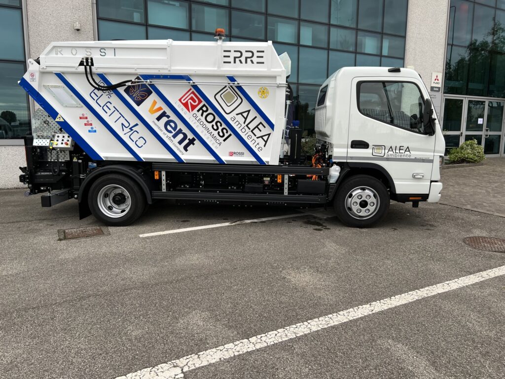E’ il primo veicolo completamente elettrico che viene utilizzato da una società di rifiuti in Italia, allestito con un’attrezzatura Rossi Oleodinamica ERRE 7 di cui sono partner dell’iniziativa, insieme a Vrent SpA, società di noleggio automezzi.